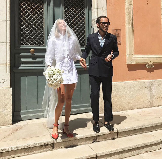 - LOLITA JACOBS | 2018. Y el mismo año hizo lo propio esta modelo y directora creativa, que al igual que Bianca y Mick Jagger, también escogió Saint-Tropez para darse el «sí, quiero». A pesar de que durante el fin de semana de celebraciones lució diferentes diseños, el que incluyo en esta lista de vestidos de novia icónicos es el minivestido camisero que combinó con un velo y bailarinas rojas, un color que no suelen escoger muchas chicas para complementar sus looks del día de la boda, de Manolo Blahnik.